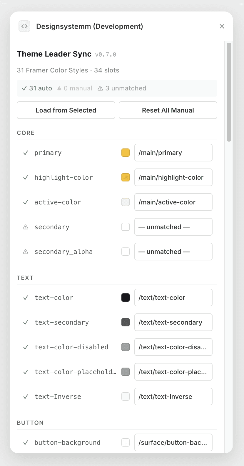 This isn't an abstract framework. It has a shape. One example from what we've been building recently — a plugin that keeps a theme system in sync with a project's color library. The agent's job isn't to make design choices. It's narrower than that: scan every color asset in the current project, match it against the 32 semantic slots the design system defines, and lay the results out.